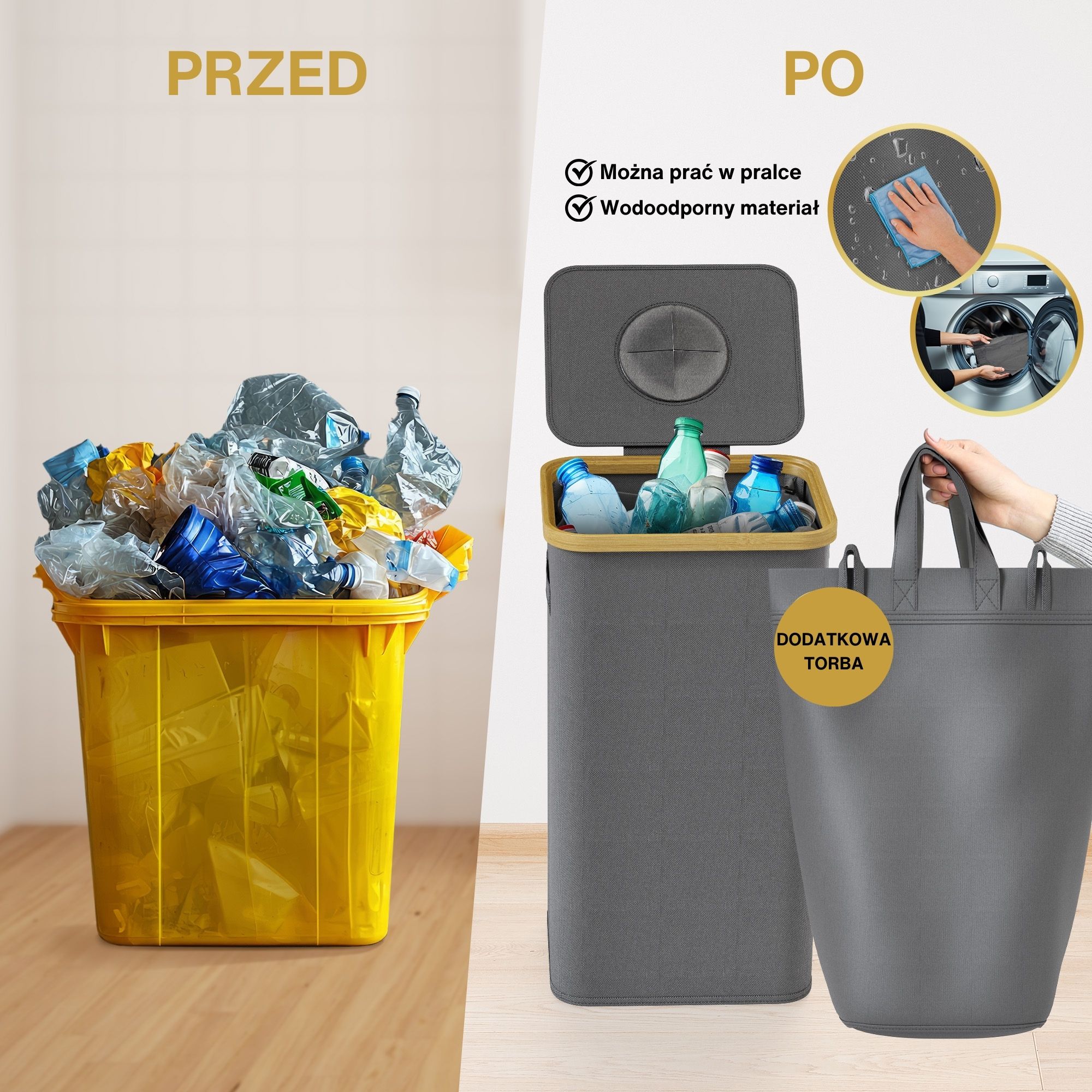 Ten pojemnik posiada wzmocnione szwy, trwałe materiały i wyrafinowany estetycznie szary kolor, który idealnie komponuje się z każdą przestrzenią – niezależnie od tego, czy jest to nowoczesne biuro, czy minimalistyczna kuchnia. Jego kompaktowa, ale pojemna konstrukcja pozwala na efektywny recykling bez zajmowania zbyt dużej przestrzeni.