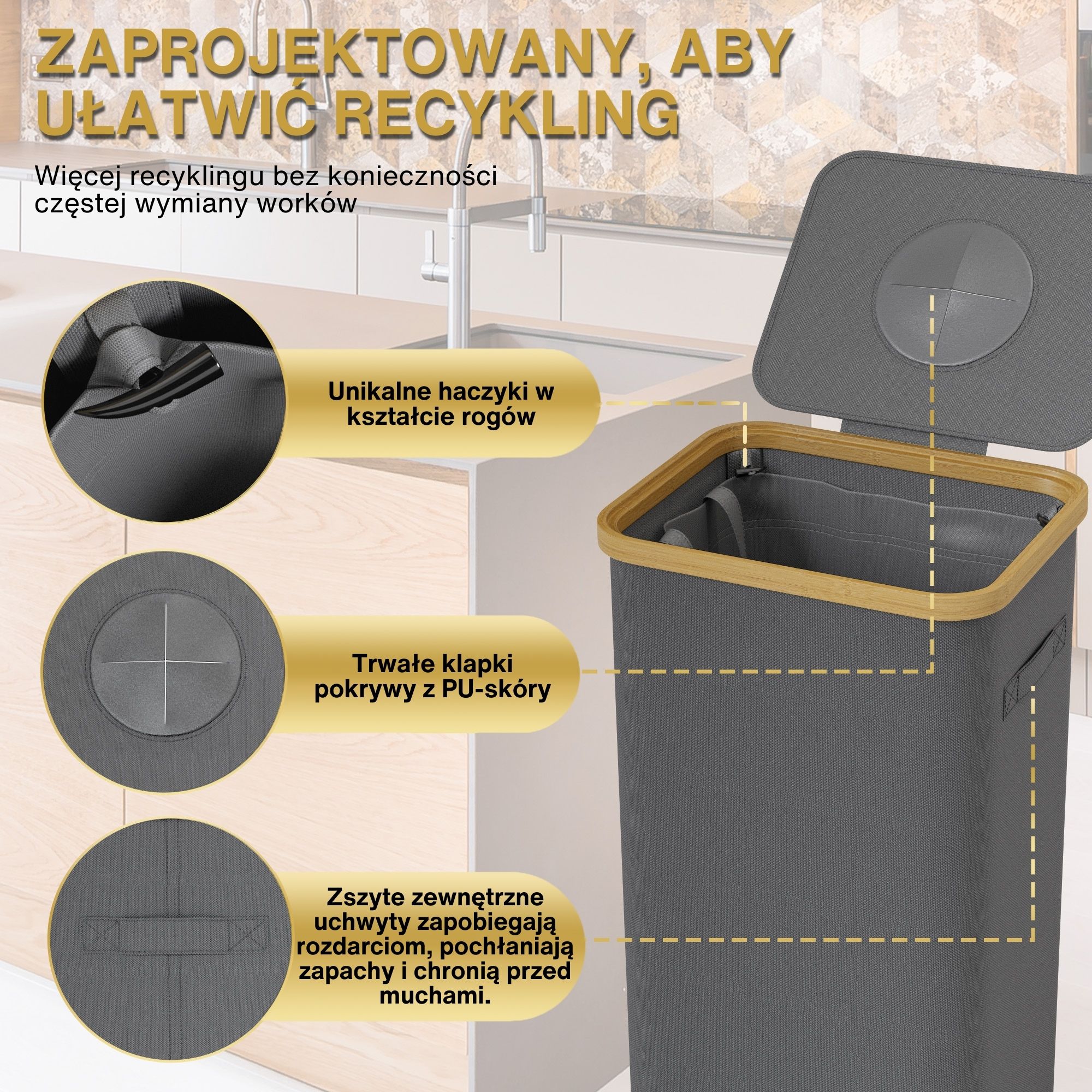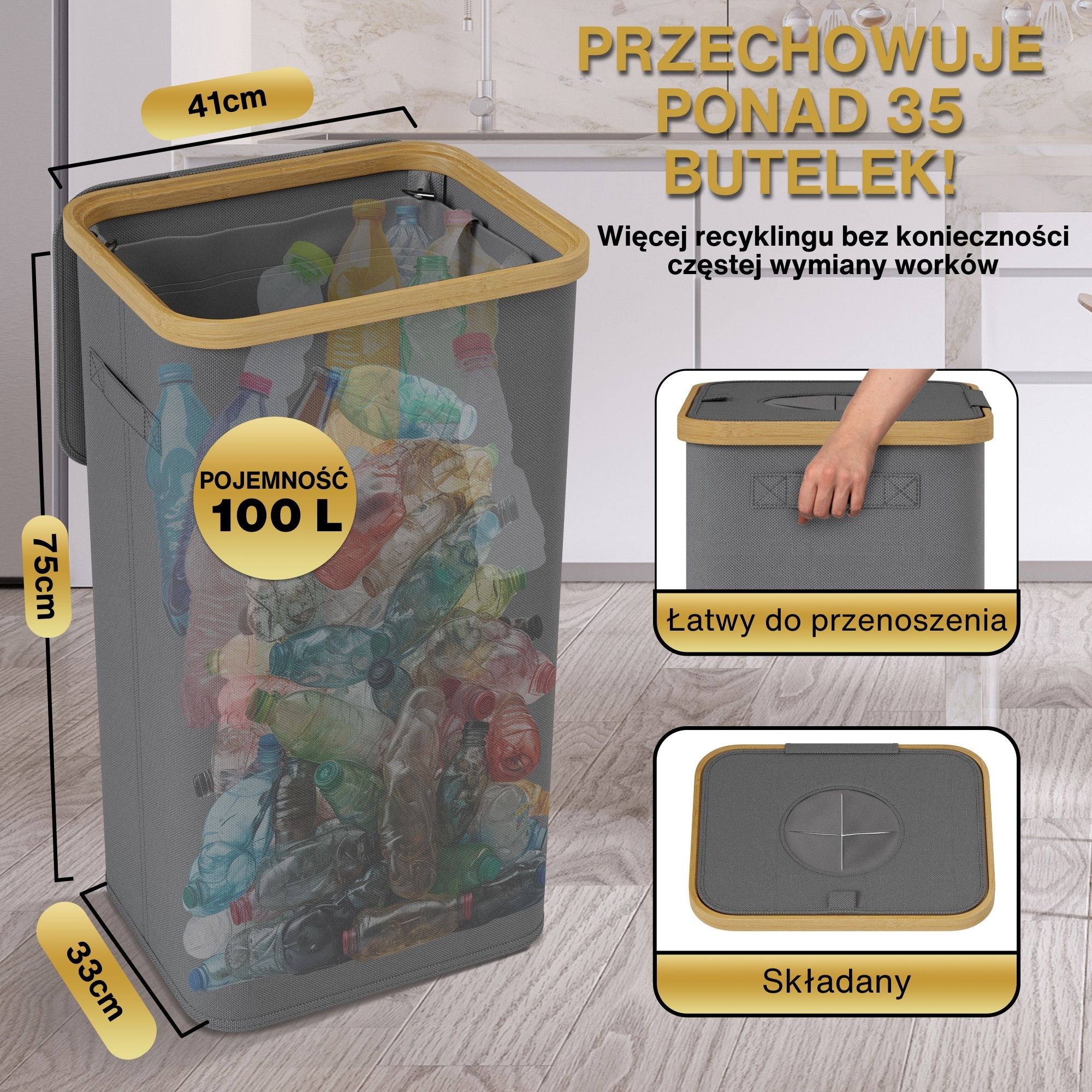 - POJEMNOŚĆ 100L: Zapewnia dużo miejsca na dużą ilość materiałów do recyklingu, od szkła po plastik. Wewnętrzny worek ułatwia podnoszenie, czyszczenie i organizację.