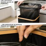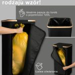Model ten charakteryzuje się wzmocnionymi szwami, wytrzymałymi materiałami i estetycznym wykończeniem w kolorze CZARNYM, który z łatwością komponuje się z każdym pomieszczeniem – zarówno nowoczesnym biurem, jak i minimalistyczną kuchnią. Jego kompaktna, ale pojemna konstrukcja umożliwia efektywny recykling bez zajmowania zbyt dużej ilości miejsca. Ponadto do kosza dołączono bambusową ramę z żelaznym pierścieniem, do której mocuje się worek na śmieci, co ułatwia jego wymianę i użytkowanie. Kosz jest przeznaczony do worków na śmieci o pojemności 90 l, ale bez problemu można używać również większych worków, nawet do 120 l.
