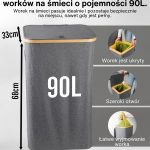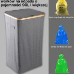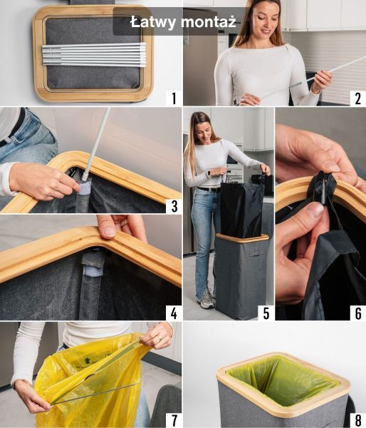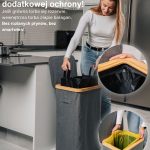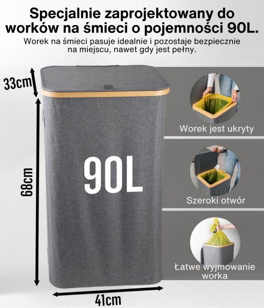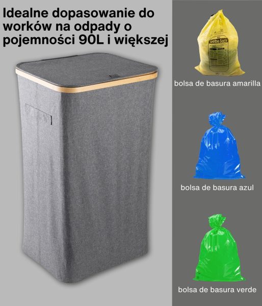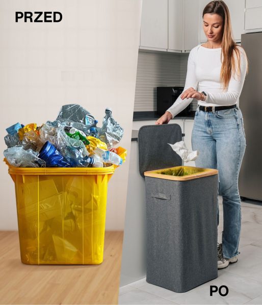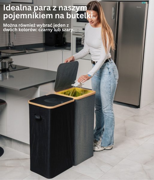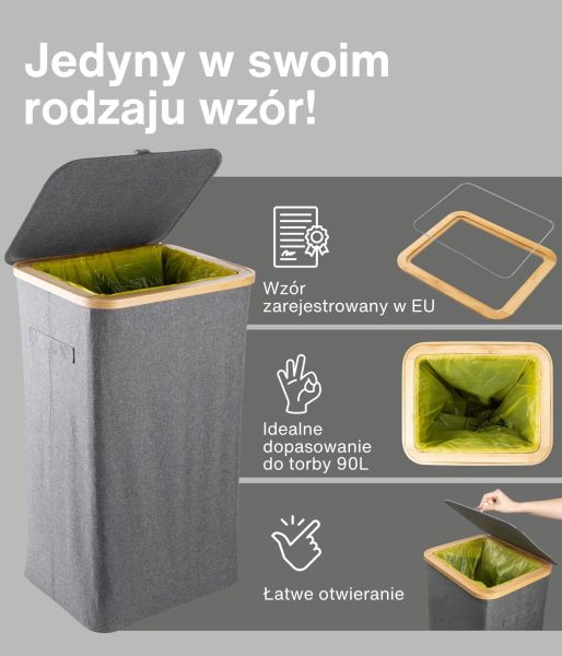 Model ten charakteryzuje się wzmocnionymi szwami, trwałymi materiałami i wyrafinowanym estetycznie szarym kolorem, który doskonale komponuje się z każdą przestrzenią – zarówno nowoczesnym biurem, jak i minimalistyczną kuchnią. Jego kompaktowa, ale przestronna konstrukcja pozwala na efektywny recykling bez zajmowania zbyt wiele miejsca. Ponadto pojemnik ma bambusową ramę z żelaznym pierścieniem, do którego przymocowany jest worek na śmieci, co ułatwia jego wymianę i użytkowanie. Kosz jest przeznaczony do worków na śmieci o pojemności 90 l, ale można z łatwością używać większych.