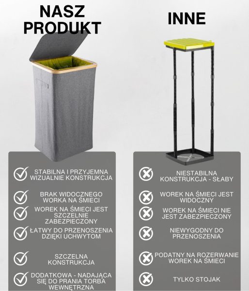 - INNOWACYJNY DESIGN: Nasza opatentowana bambusowa rama z metalowym pierścieniem bezpiecznie utrzymuje worek na śmieci na miejscu i zapobiega jego zwisaniu. Pokrywa z tkaniny dyskretnie ukrywa odpady i zapobiega powstawaniu nieprzyjemnych zapachów.