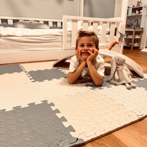 Wykonany z wysokiej jakości, nietoksycznej pianki EVA o grubości 1,2 cm, aby zapewnić dziecku bezpieczeństwo i wygodę. Zapobiega wypadkom, izolując każdy upadek od twardej podłogi. Powierzchnia maty jest wodoodporna i trwała oraz bardzo łatwa do czyszczenia wilgotną szmatką.