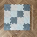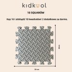 Panele piankowe o wymiarach 30 × 30 cm. Zestaw składa się z 16 sztuk (i 2 dodatkowych luźnych paneli). Całkowity rozmiar wykładziny to 2,5 metra kwadratowego. Może być stosowany w różnych pomieszczeniach, a nawet na zewnątrz.